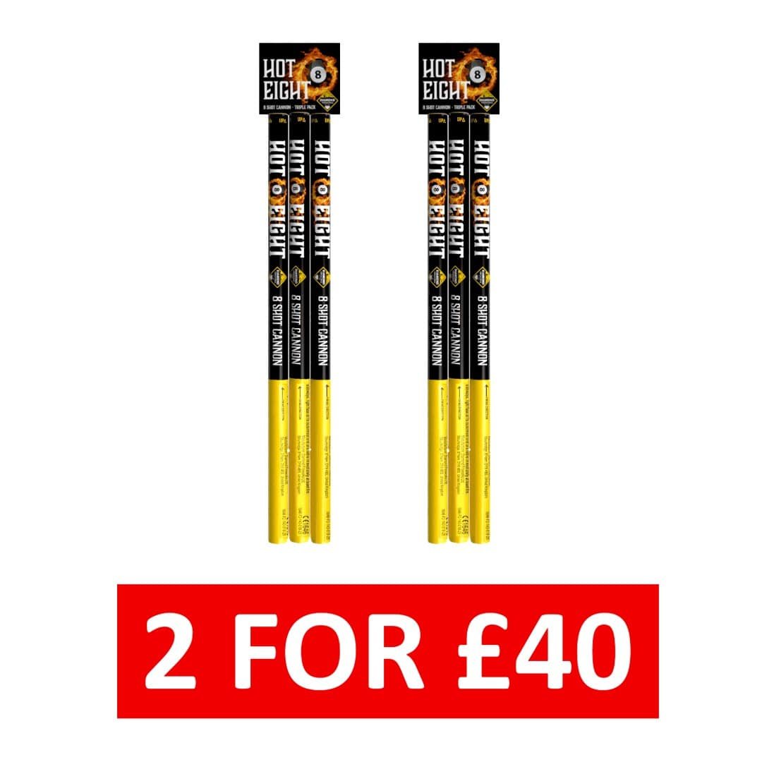 Hot 8 cannon, because candle just didn’t describe it. Each cannon contains 8 monster shots, 4 different effects and colours. Be sure to stand back and prepare to be impressed as each huge ball ignites the night sky!
